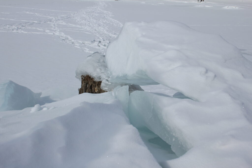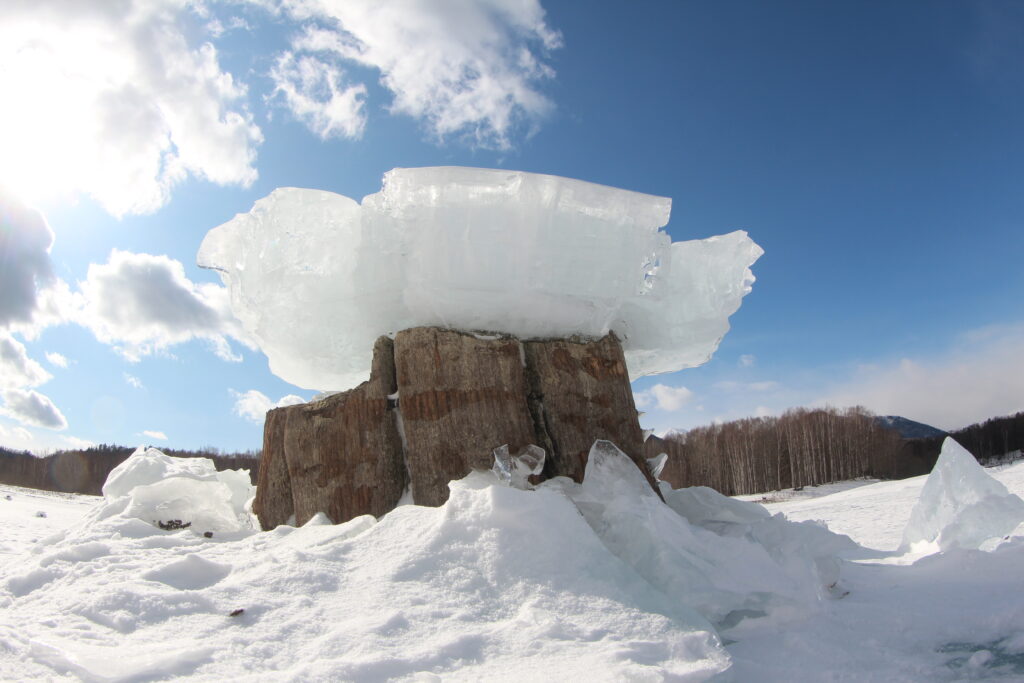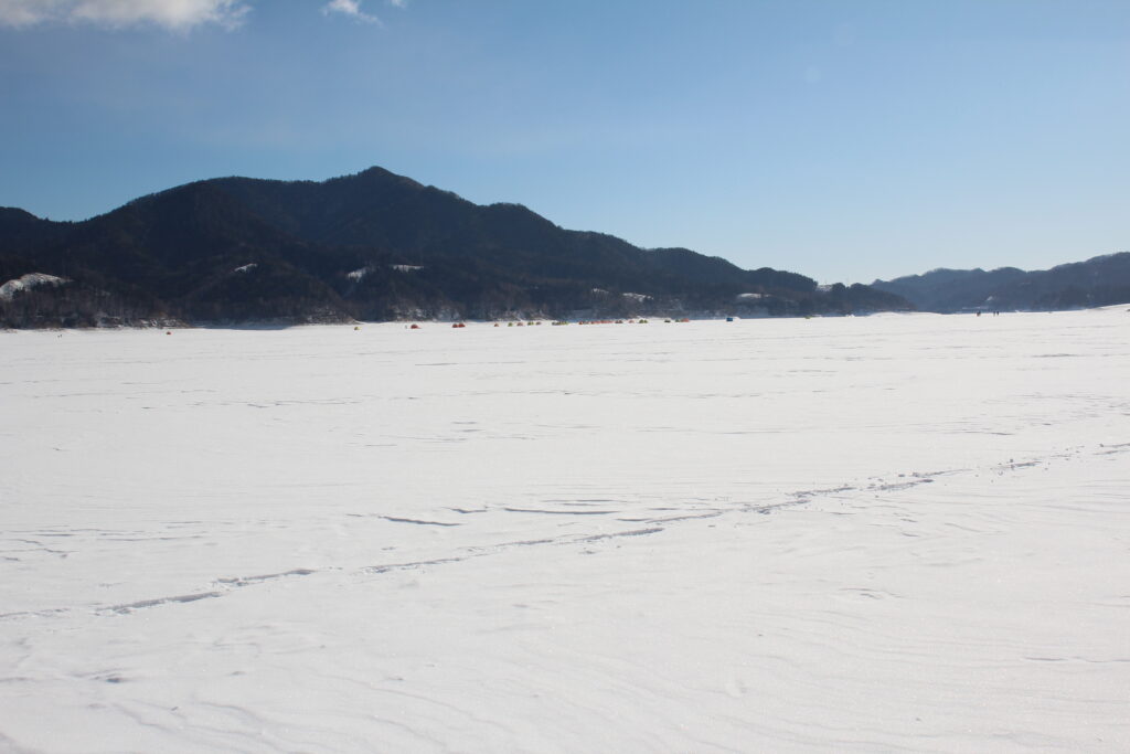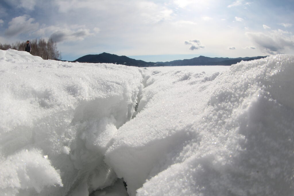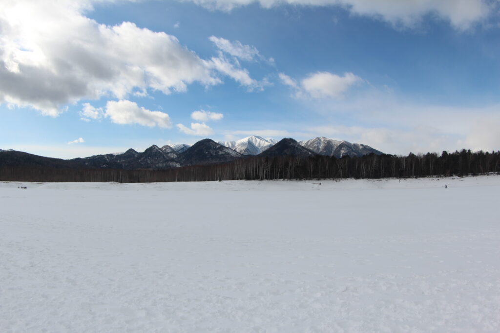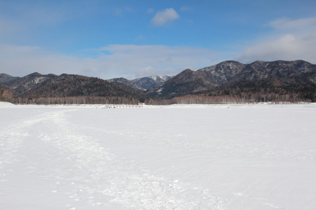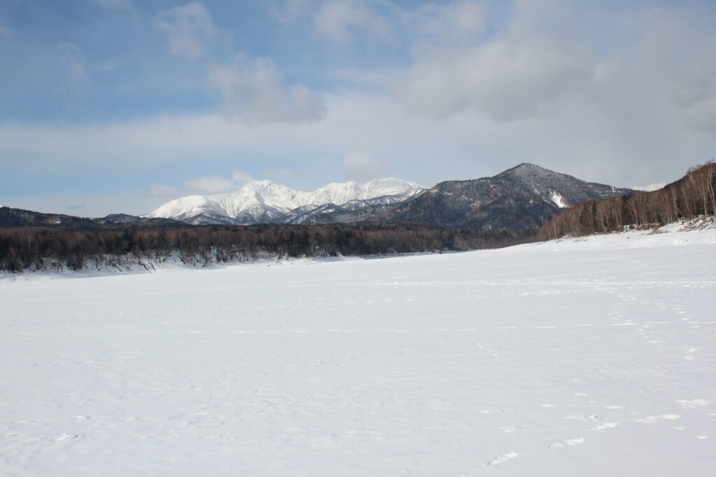 氷点下の冷たい空気を吸い込みながら、真っ白に凍りついた糠平湖の上を歩き出します。 一歩進むごとに、スノーシューが雪を噛む音が静寂に響く。 遮るもののない広大な雪原。その先に、その姿は突如として現れました。