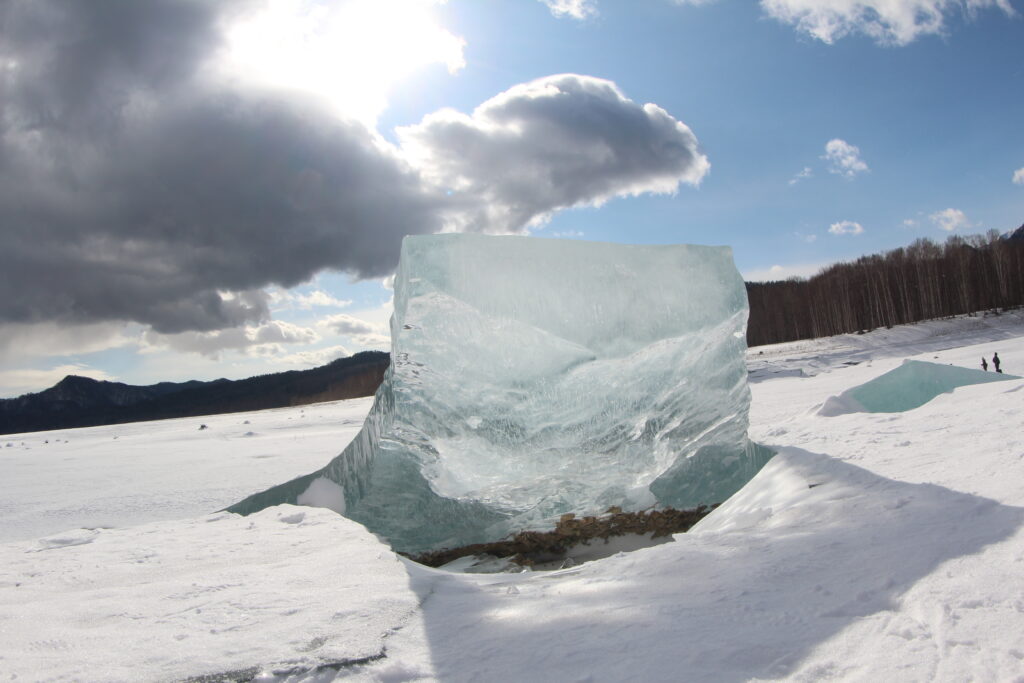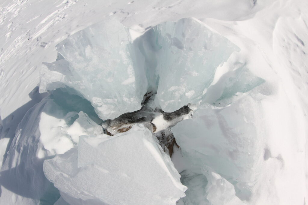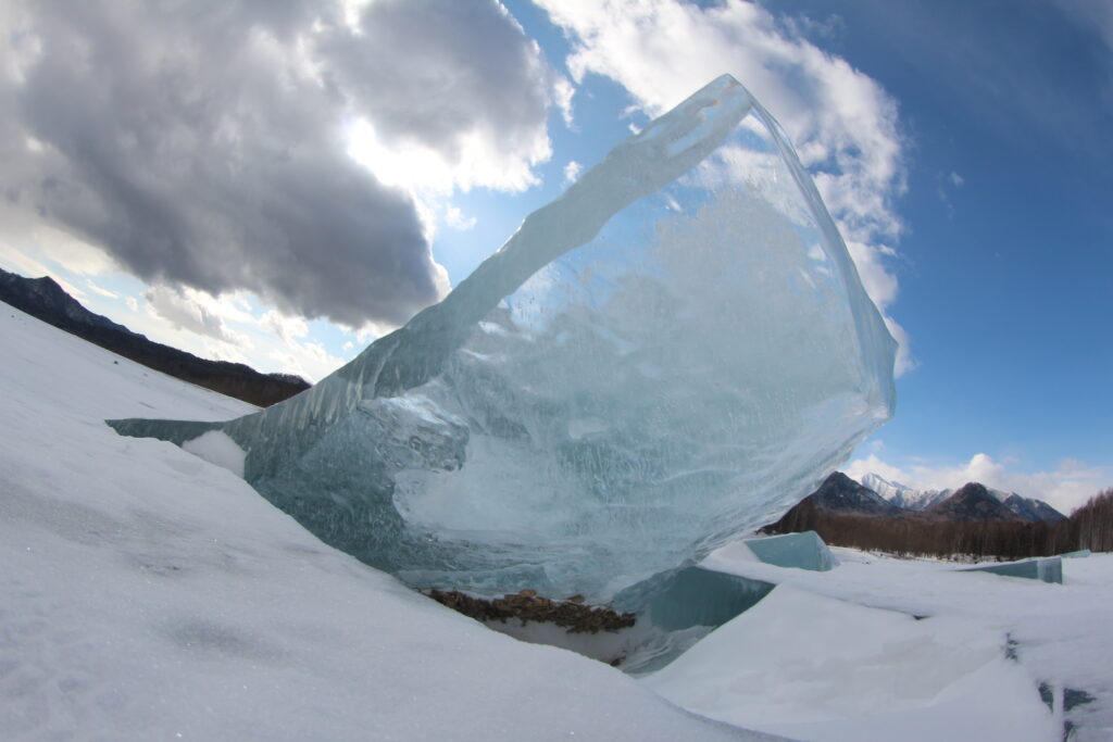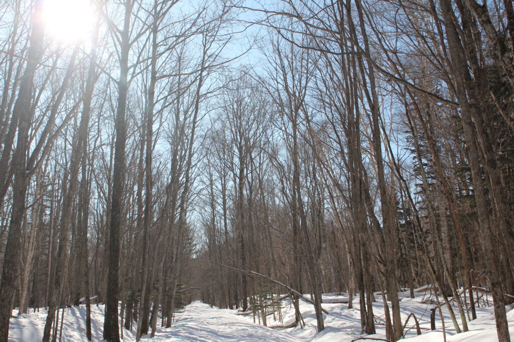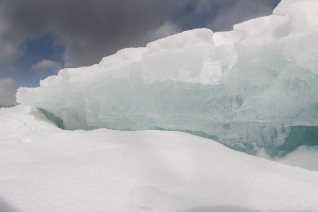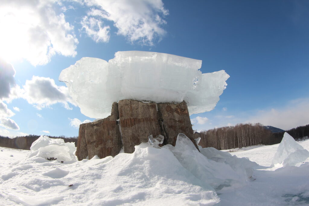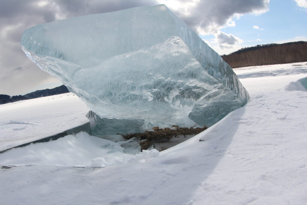 氷点下の冷たい空気を吸い込みながら、真っ白に凍りついた糠平湖の上を歩き出します。 一歩進むごとに、スノーシューが雪を噛む音が静寂に響く。 遮るもののない広大な雪原。その先に、その姿は突如として現れました。